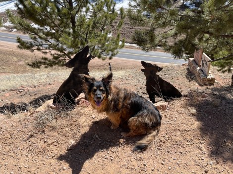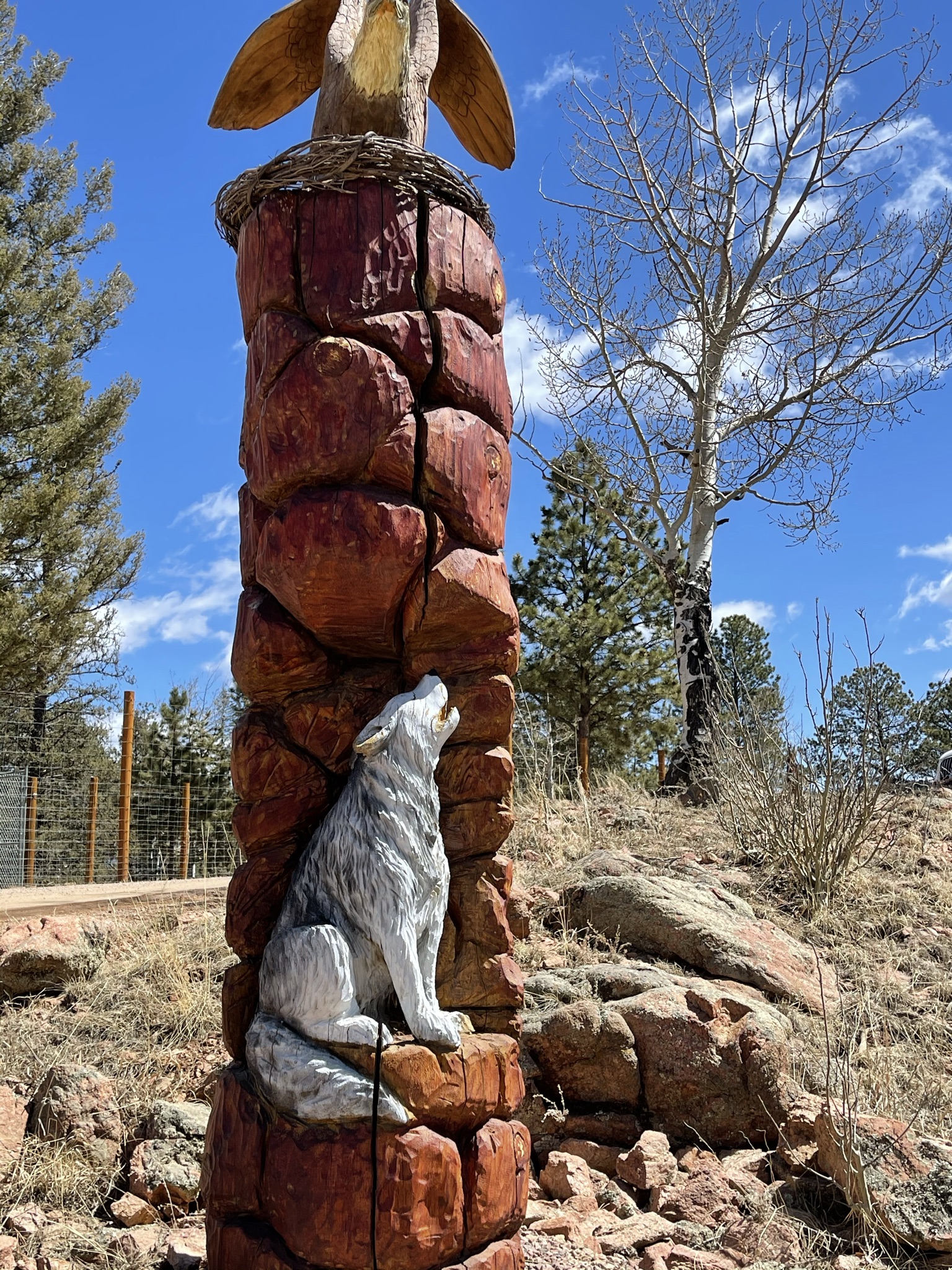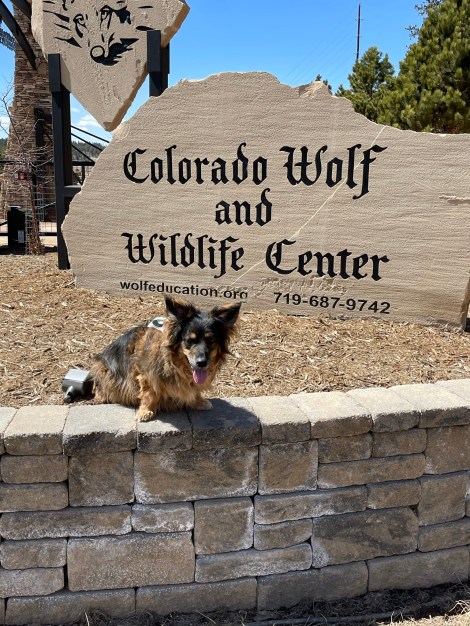 Once Ellie seemed energetic enough, I grabbed her from the trailer, and we walked down the long driveway. I captured some pics of wolf wood carvings, iron cutouts, and the sign on the road. Ellie enjoyed all of the attention, and my excitement, though muted to a casual observer, was heightened.