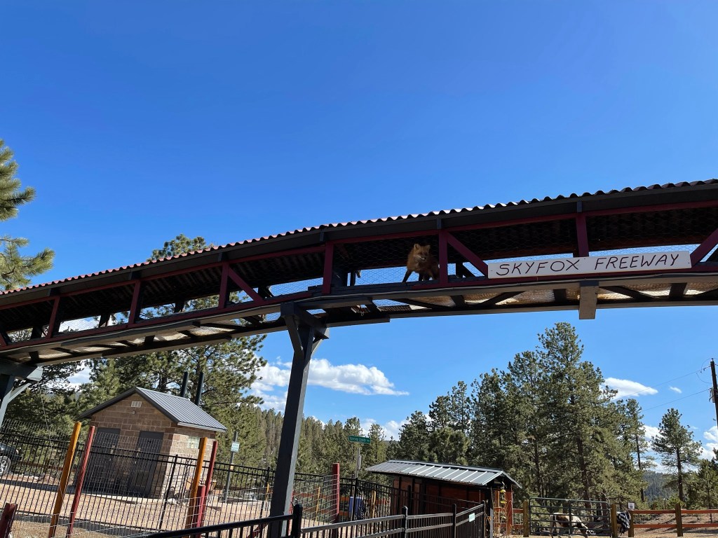 I walked down to what appeared to be the office, which allowed me to walk past the fox enclosures and bridge. A skyway-looking bridge that connected fox enclosures on either side of the path for humans to take to get to the gift shop and office. I walked into the gift shop, and they had so much stuff. They were a well-developed commerce site.