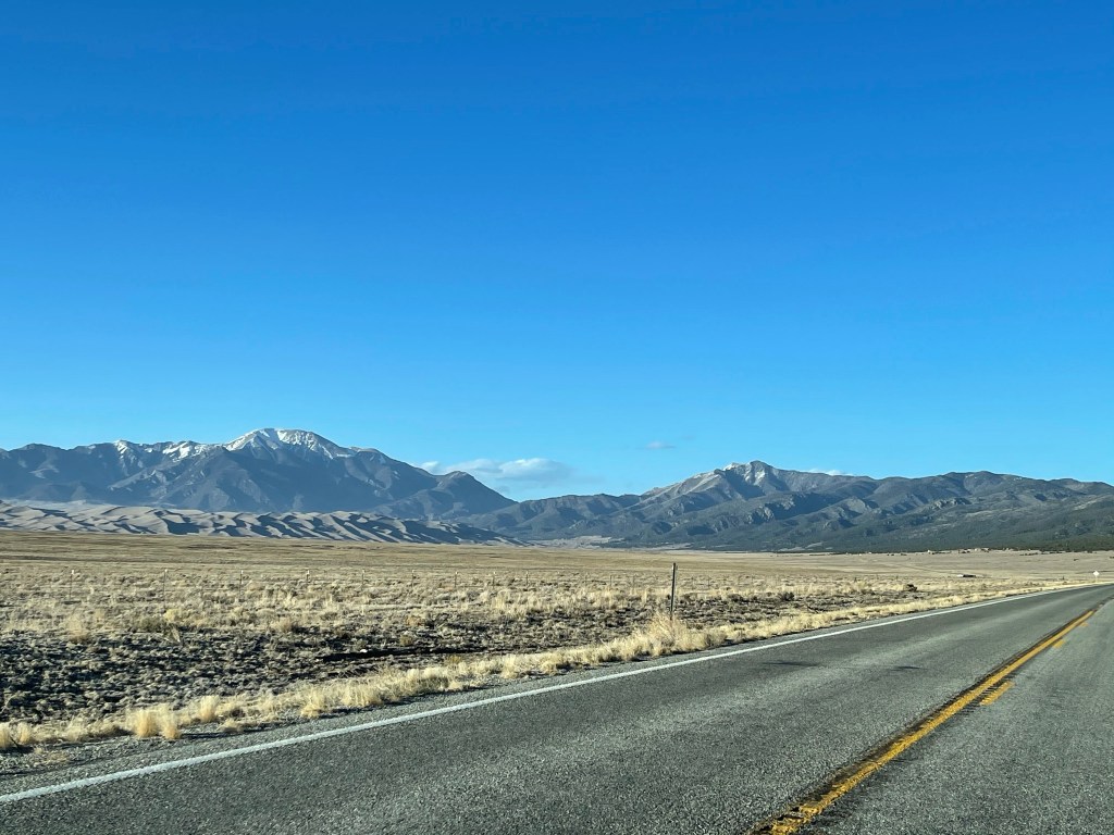 Loaded Ellie up, set the GPS for the Great Sand Dunes, and off we went. The experience with Micah was still fresh in my mind. We drove through some really pretty terrain. When I had made the turn onto the final main road, I could have sworn I saw the Sand Dunes in the mountains. My mind kept playing tricks on me, that no dunes could exist in a mountain range. My estimations approximated the dunes smack in the center of the range of mountains visible from this road.