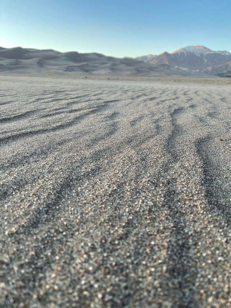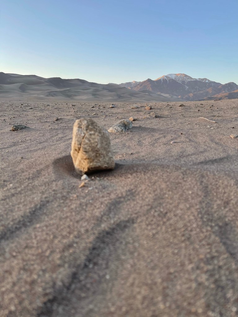 I saw wind-blown patterns in the sand that no one had stepped onto. I saw isolated rocks and driftwood sitting in the sand. My newer phone had extra lenses built-in that gave the wide-angle view so elegantly. I stuck my phone in the sand to capture these moments. I went all artsy-fartsy, in a desert with dunes IN a mountain range. Couldn’t get any more surreal than that.