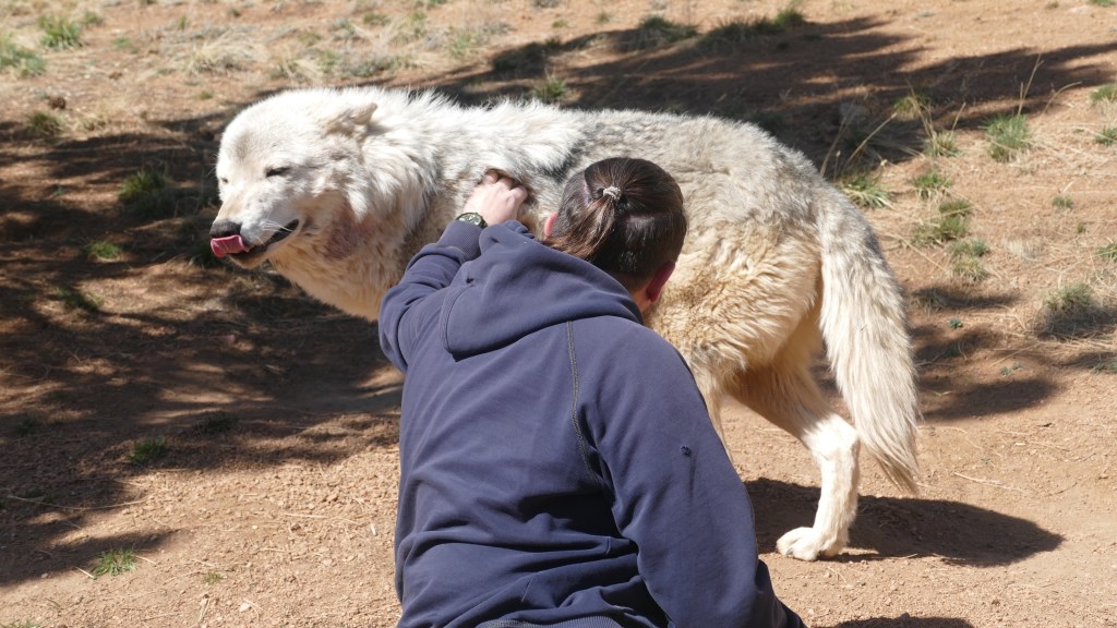 We are now in the pen of Micah. He comes to greet all three of us. He gives initial sniffs of the handlers, as he knew them better than me, believe it or not. They tried to guide him away from them, towards me. We all walked deeper into the pen, and they recommended I sit on the ground. Micah would come up to me, once sat down. Without hesitation, I reached my hand out to him, for him to determine what his next action would be. He stood by me. I started rubbing his front shoulders, which he really enjoyed.
