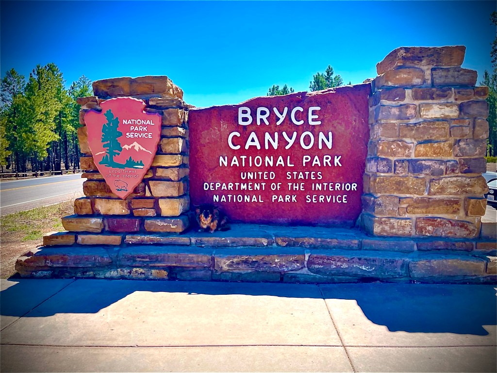 We pull into the quaint little town of Bryce, Utah, just outside the entrance of the park around 2:30 p.m. Still plenty of light to peruse the park with. We pull into the little alcove for the National Park sign. There were tons of kids and parents wandering around aimlessly. I wait patiently for the timing to be clear for me to release my little Kraken. Once I see people dissipating, I bring the little monster out. Up to the sign, she waddles. I take the leash off and snap pics. I hear the ‘awwws’ and ‘ohhhhhhs’ from some of the people bearing witness to our ritual to get proof we were somewhere – or bear minimum, at least Ellie was there, for all we know, I was nowhere near these places…