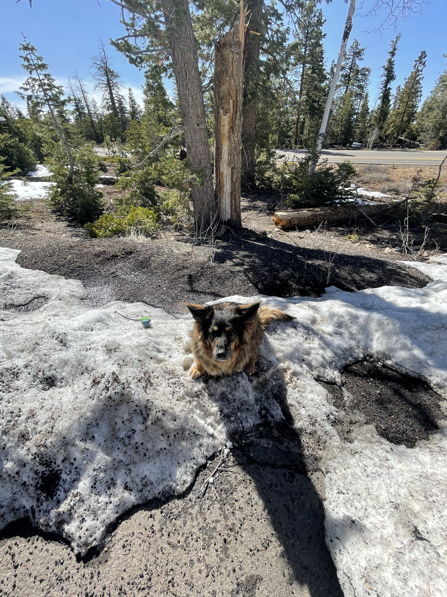 As soon as she got as much water as she wanted, I threw the pickle for her to chase. Even though she didn’t fully bring it back to me, I saw her rolling around in the big snow pile near us. She was having a blast being free of her taco and being in the coolness of the snow. She would do rolls and flips atop the snow, then stand up. As she stood up, she would smile with her tongue hanging out. The bliss on her face was supremely satisfying. She was happy. I was happy she was happy. She was happy I was happy she was happy. You see how that cycle goes. It almost passes for an Ouroboros.